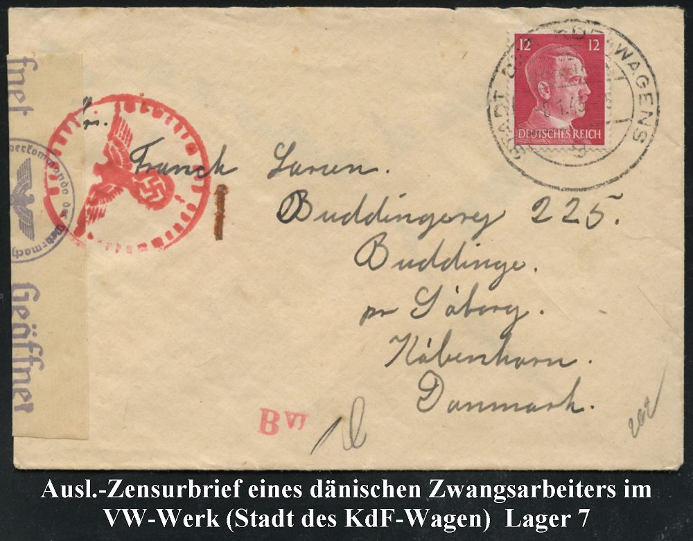 | 1672 | 65 € | ZWANGSARBEIT / LAGER : STADT DES KDF-WAGENS/ BEI/ FALLERSLEBEN/ g 1943 (8.1.) 2K-HdN auf EF 12 Pf. Hitler + roter Zensur-1K: Geprüft "f" + Verschlußstreifen "Geöffnet f" = Hamburg, rs. hs. Abs.: "...Dänische Lager Stadt des K.d.F. Wagens, Gem.(einschafts) Lager /.." (Bf. rs. etw. rauh geöffnet) sehr seltener Ausl.-Zensur-Bf. eines d ä n i s c h e n Zwangsarbeiters n. Kopenhagen + Faksimle des KdF-Barackenlagers (Mi.788 EF = "Europa"-Inlands-Tarif!) | | |