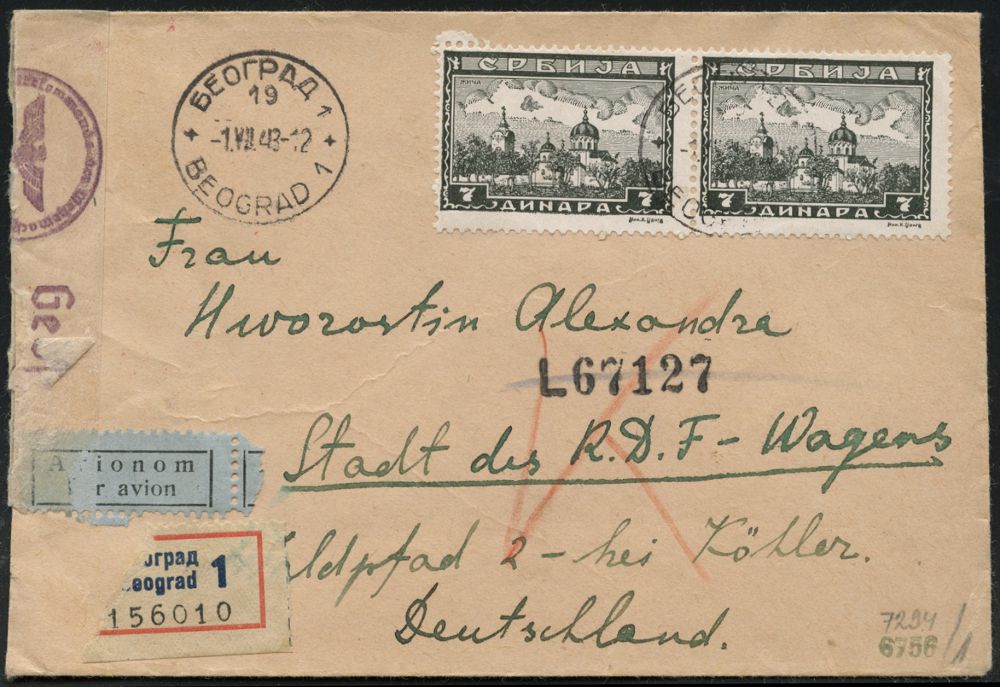 | 1678 | 60 € | ZWANGSARBEIT / LAGER : SERBIEN / DT. BES. SERBIEN 1943 (1.7.) 7 Din. "Kloster Zica" Paar, gest. BEOGRAD + (unvollständiger) R-Zettel Beograd 1 (durch Teilablösung des Zensurstreifen teils abgerissen) , OKW-Eingangs-Zensurstreifen "g" + rotes Segment "Geprüft" + schw. Zensur-Paginierstpl. = Wien, Ausl.-Zensur-Bf. an eine Serbin "Stadt des K.D.F.-Wagens", rs. AS.: STADT DES KDF-WAGENS../g, sehr seltener Ausl.-R-Zensur-Bf.! (Mi.79 MeF + 25.- EUR) | | |