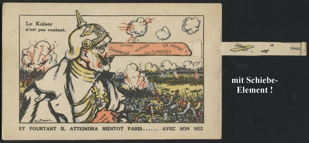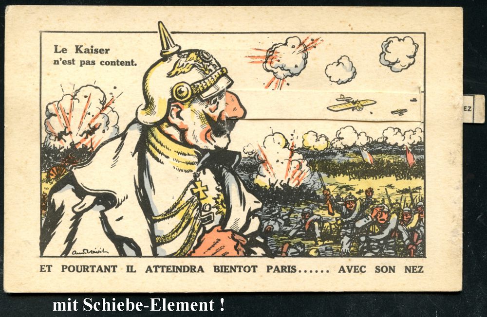| 101 | 25 € | DIE REGENTSCHAFT WILHELMS II. 1888 - 1918 : FRANKREICH 1914 Künster-Color-Ak.: Le Kaiser n´est pas content.. (Der Kaiser ist nicht zufrieden) mit Wilhelms großer Nase zum Heruasziehen mit Flugzeugen (französ. Truppen schlagen deutsche Truppen zurück) mit Künstler-Signatur, ungebr., mit Zensur-Freigabevermerk, selten! (Uhv,Imp. Kauffmann, Paris) | | |
