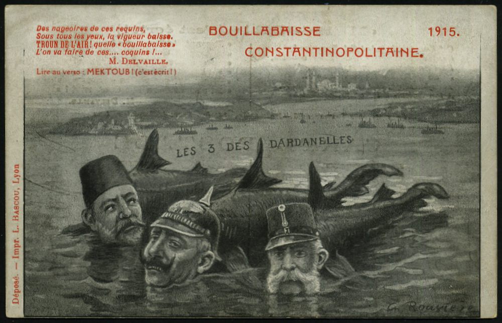 | 105 | 15 € | DIE REGENTSCHAFT WILHELMS II. 1888 - 1918 : FRANKREICH / TÜRKEI 1915 zweifarbige Propaganda-Künstler-Ak.: Konstantinopler Fischsuppe = Sultan Mehmet V., Kaiser Wilhelm II., Franz-Joseph I. als gestrandete Fische vor den Dardanellen u. Konstantinopel, sign. G. Rousièze, rs. M. Delvaille (Uhv. Impr. L. Bascou, Lyon, rs. M. Delvaille, Lyon) ungebr., | | |