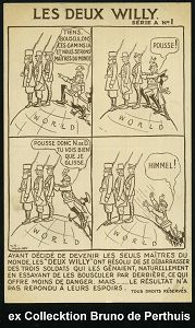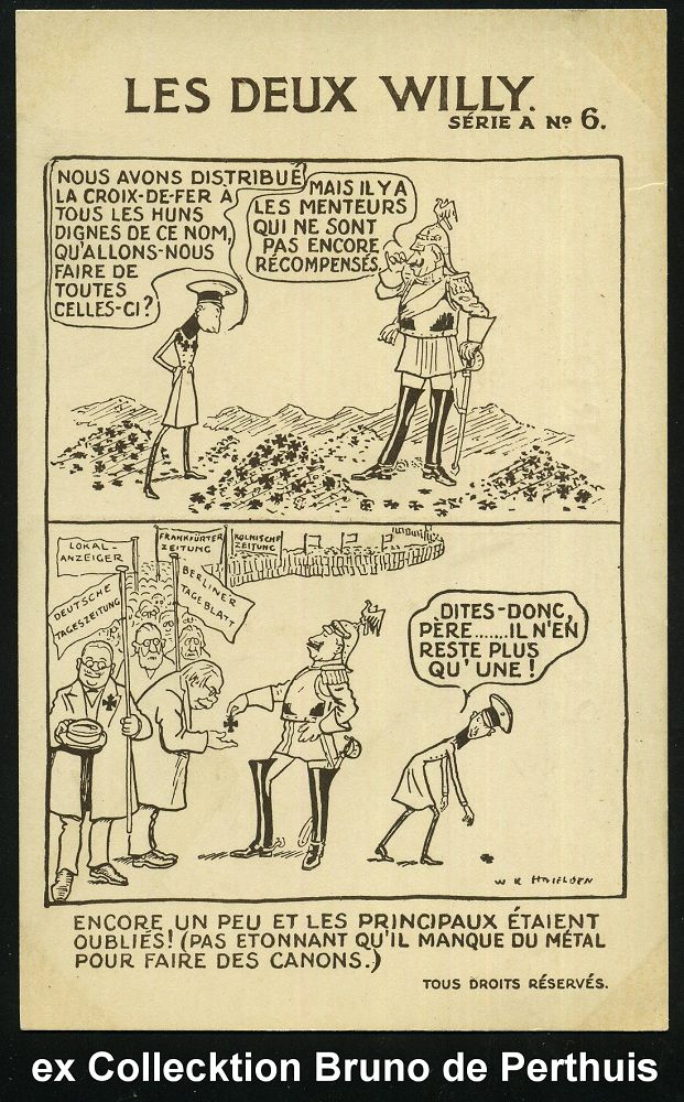 | 111 | 75 € | DIE REGENTSCHAFT WILHELMS II. 1888 - 1918 : GROSSBRITANNIEN 1914 monochrome Propaganda-Künstler-Ak.: LES DEUX WILLY SERIE A No.1 - 6: Wilhelm II. u. Kronzprinz, der Versuch, die Welt zu beherrschen mit Comic-Bildern, sign. W. K. HASELDEN (1872-1953) "Vater" des britischen Comic-Strip, berühmter Karikaturist (Uhv.Harrison, Jehring & Co., London) ungebr., seltene Serie von 6 Künstler-Ak. komplett! (evetl. Einzelausruf möglich: je 16.- EUR) | | |