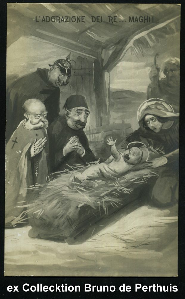 | 113 | 15 € | DIE REGENTSCHAFT WILHELMS II. 1888 - 1918 : ITALIEN / TÜRKEI 1915 s/w.-Propaganda-Künstler-Ak: Die Anbetung der Heiligen Drei Könige.. = Kaiser Wilhelm II., Franz-Joseph I und Mehmet V. , das Jesus-Kind wendet sich mit Schrecken, Maria u. Joseph (Uhv. P G & C F) ungebr., selten! | | |