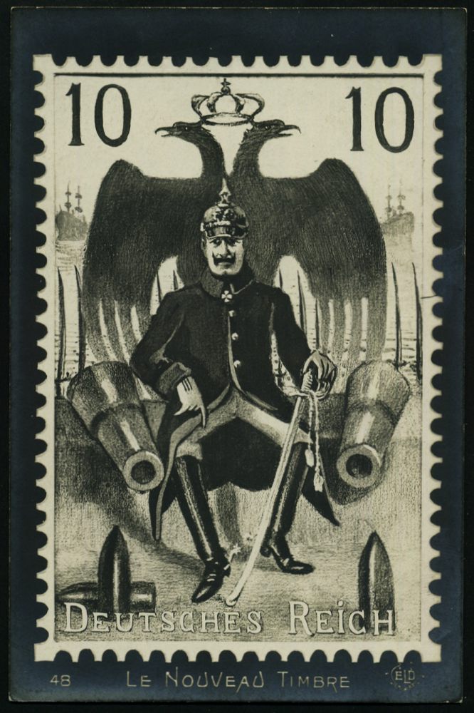 | 98 | 18 € | DIE REGENTSCHAFT WILHELMS II. 1888 - 1918 : FRANKREICH 1914 s/w.-Propaganda-Künstler-Ak.: DEUTSCHES REICH, LE NOUVEAU TIMBRE = 10 Pf.-Briefmarke Wilhelm II als Kriegsherr (Uhv. ELD 48) ungebr., selten! | | |