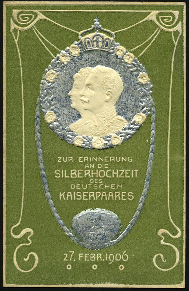 | 91 | 18 € | DIE REGENTSCHAFT WILHELMS II. 1888 - 1918 : HAMBURG/ *1ag 1906 (27.2.) 1K-Gitter auf monochromer Color-Relief-Ak.: SILBERHOCHZEIT DES DEUTSCHEN KAISERPAARES 27. FEBR. 1906 mit Blindprägung des Kaiser-Paares etc., Bedarf, selten! | | |