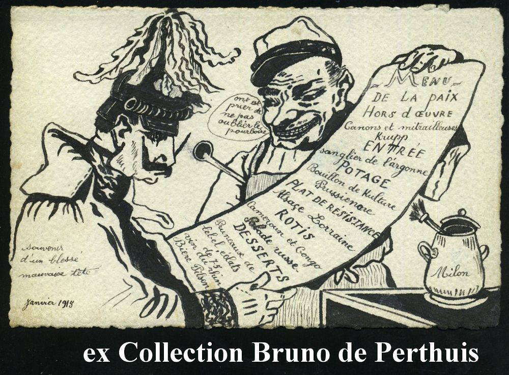 | 109 | 30 € | DIE REGENTSCHAFT WILHELMS II. 1888 - 1918 : FRANKREICH 1915 (Jan.) orig. handgezeichnete Propaganda-Ak.: MENU DE LA PAIX.. = Franzose hält Wilhelm II. die "Friedens-Speisekarte" hin.., sign. Milon = schwarze Federzeichnung, ungebr., seltenes Unikat! | | |