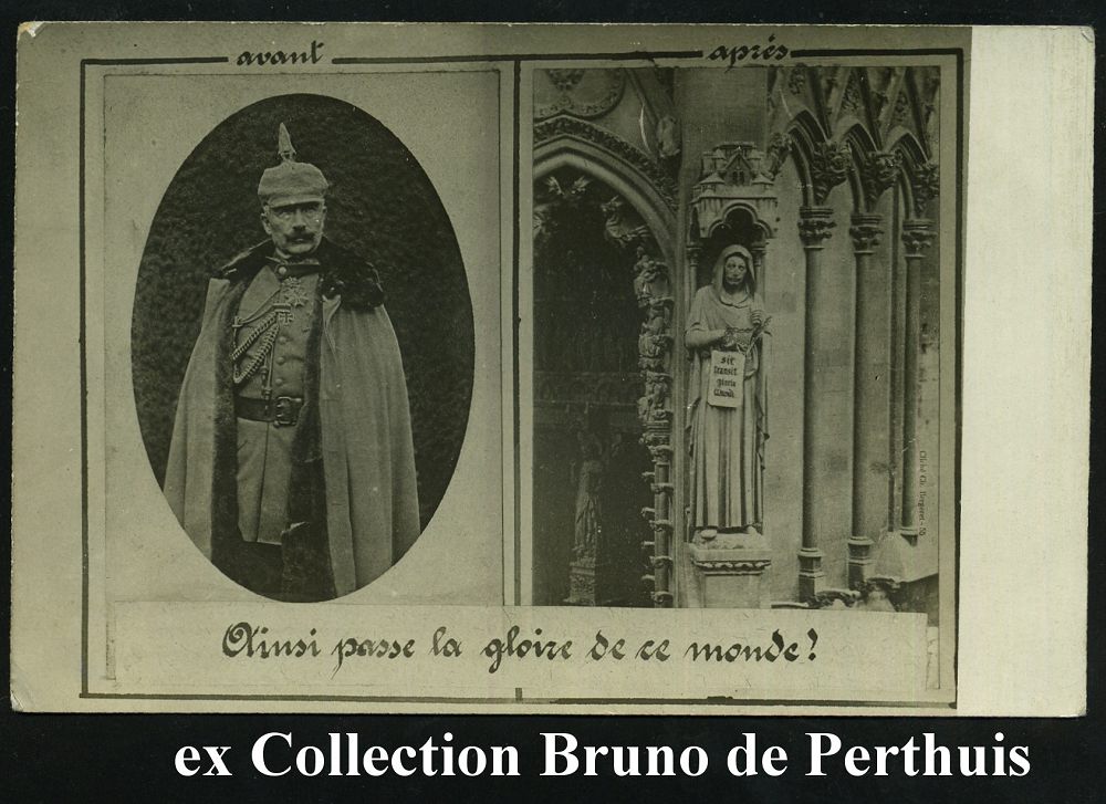 | 110 | 15 € | DIE REGENTSCHAFT WILHELMS II. 1888 - 1918 : FRANKREICH 1918 Propaganda-Foto-Ak.: Vorher - nachher, so vergeht der Ruhm der Welt = Wilhelm II. In Militär-Uniform, Wilhelm II. als versteinerte Kirchenportal-Figur (ohne Uhv.) ungebr., selten! | | |