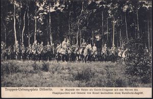 | 90 | 15 € | DIE REGENTSCHAFT WILHELMS II. 1888 - 1918 : DÖBERITZ/ *ÜBUNGSPLATZ/ a 1903 (14.3.) 1K-Gitter auf s/w.Foto-Ak: Wilhelm II als Garde-Dragoner mit Generalstabsoffizieren u. Gen. von Kessel beobachten Kavallerie-Angriff (Frankatur Stockpunkte) Bedarf (Mi.85 I) | | |