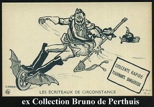 | 97 | 15 € | DIE REGENTSCHAFT WILHELMS II. 1888 - 1918 : FRANKREICH 1914 monochrome Propaganda-Künstler-Ak.: Schnelle Landung.. = Wilhelm II. auf "Vampir-Rad" das Gleichgewicht verlierend , sign. H.(ENRI) AURRENS (1873-1934, französ. Maler) ungebr. (Uhv. GiP 8e Série No. 6) ungebr., selten! | | |