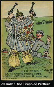 | 99 | 15 € | DIE REGENTSCHAFT WILHELMS II. 1888 - 1918 : FRANKREICH 1914 Color-Propaganda-Künstler-Ak.: ER IST TAPFER! .. der Feind 80km entfernt = Wilhelm II. mit Matratze als Schutz und mit Orden behangen etc., sign. G: VIGNAC 1914 (Uhv. Librairie de Estampe, Paris) rs. Text (vom Sept. 1916) ungebr., selten! | | |