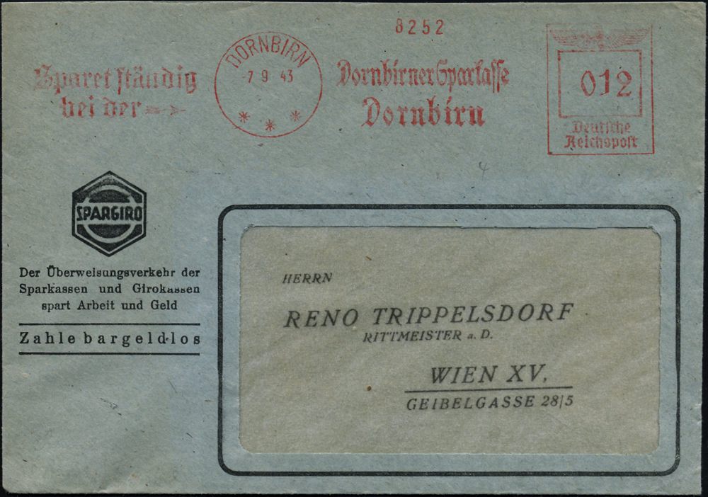 | 1727 | 20 € | GESCHICHTE ÖSTERREICH 1938-45 / OSTMARK : DORNBIRN/ ***/ Sparet ständig/ bei der/ Dornbirner Sparkasse.. 1943 (7.9.) seltener, aptierter AFS Francotyp, Typ mit Doppel-Klischee + Sterne im Ortsstempel = n u r in Österreich! , Firmen-Reklame-Bf.: SPARGIRO.. (Dü.E-5CEh aptiert, n u r in Österreich !) | | |