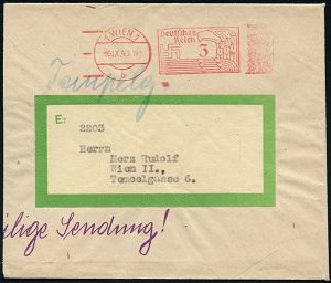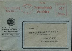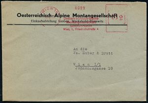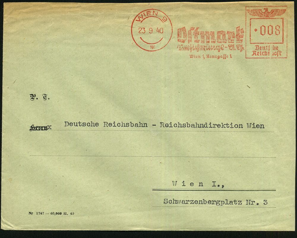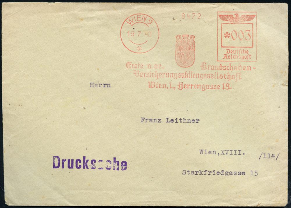 | 1752 | 15 € | GESCHICHTE ÖSTERREICH 1938-45 / OSTMARK : WIEN 9/ */ Ostmark/ Versicherungs-AG.. 1940 (23.9.) aptierter, österr. AFS Francotyp "Reichsadler" mit altem, österr. Ortsstempel + Stern , teils Sütterlin (Bf. oben schwache Bräunung) Orts-Bf. (Dü.E-5DG aptiert) | | |