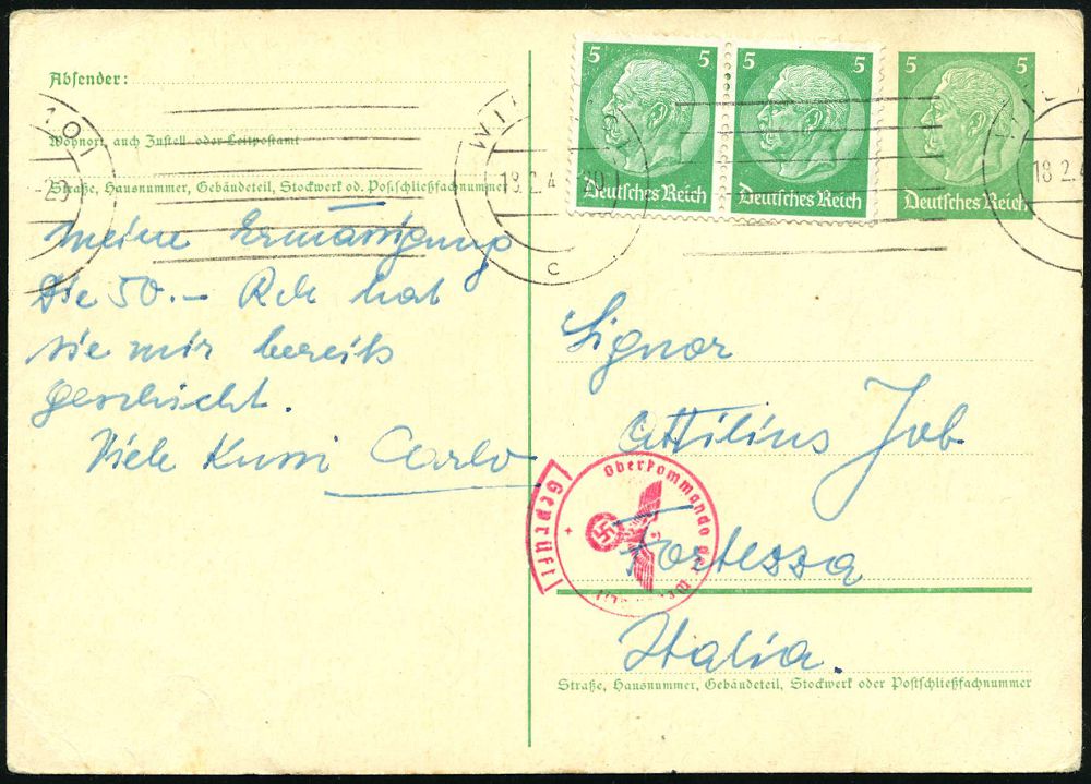 | 1754 | 23 € | GESCHICHTE ÖSTERREICH 1938-45 / OSTMARK : WIEN 101/ c 1940 (18.2.) Band-MSt auf Orts-P 5 Pf. Hindenbg. + 2x 5 Pf. Hindenbg. = 15 Pf. + kleiner Zensur-1K-Segm.: Geprüft = München (Rie.D-1 + 200 Pkte., nur Jan.-Mai 1940 verwendet) Ausl.-Zensur-Kt. n. Italien (Mi.P 225 I, 2x Mi.515) | | |
