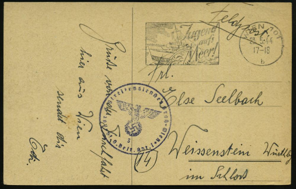 | 1759 | 16 € | GESCHICHTE ÖSTERREICH 1938-45 / OSTMARK : WIEN 101/ b(Jugend/ aufs/ Meer! 1944 (23.5.) MWSt = Schnellboot + viol. 1K-HdN: Kdr. d. Streifendienstes Groß-Wien.. , klar gest. s/w.-Feldpost-Ak.: Schönbrunn = Sicherungs-Einheit ! (Bo.S 413 A) | | |