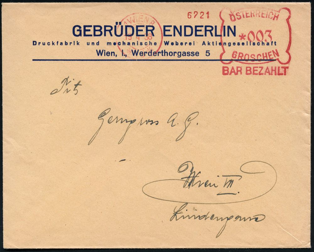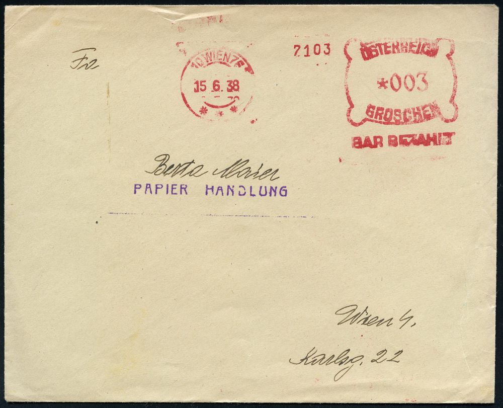 | 1739 | 25 € | GESCHICHTE ÖSTERREICH 1938-45 / OSTMARK : 1 WIEN (/ *d*/ ÖSTERREICH/ 003/ GROSCHEN/ BAR BEZAHLT 1938 (19.4.) österr. PFS unverändert weiterverwendet nach dem "Anschluß" in Groschen-Währung , klar gest. Firmen-Orts-Bf.: Gebr. Enderlein, nur kurze Verwendungszeit! (Francotyp Ah) | | |