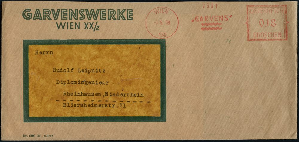 | 1736 | 30 € | GESCHICHTE ÖSTERREICH 1938-45 / OSTMARK : WIEN/ 130/ "GARVENS" 1938 (7.5.) österrer. AFS 018 Groschen weiterverwendet nach dem "Anschluß" , Firmen-Reklame-Bf.: GARVENSWERKE WIEN (rs. Elektromotiren, Wasser-Pumpen etc.) Fern-Bf., rs. Siegel-Oblate (Dü.E-6A-153h, nur sehr kurze Verwendungszeit!) | | |