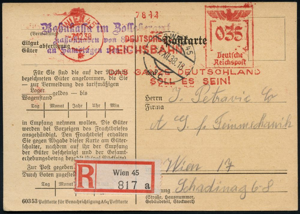 | 1742 | 50 € | GESCHICHTE ÖSTERREICH 1938-45 / OSTMARK : WIEN 45/ */ DEUTSCHE/ REICHSBAHN/ DAS GANZE DEUTSCHLAND/ SOLL ES SEIN! 1938 (7.12.) seltener, aptierter ehem. österr. AFS 035 Pf. mit altem österr. Ortsstempel und Text zum "Anschluß" Österreichs! + Reichspost-RZ: Wien 45/a, sehr seltene Orts-R-Karte, seltene Portostufe! (Dü.E-5BAh, ungenormt) | | |