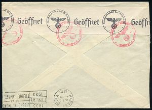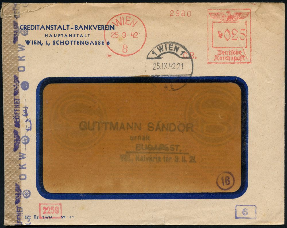 | 1758 | 20 € | GESCHICHTE ÖSTERREICH 1938-45 / OSTMARK : WIEN/ 8/ C.B. 1942 (25.9.) anonymer AFS Francotyp "Reichsadler" 025 Pf. = CREDITANSTALT-BANKVEREIN.. + 1K-Brücke 1 WIEN 1/4i + viol. OKW-Zensur-Band-Stpl. + neutraler Streifen = Wien (Bf. oben kl. Öffnungsmäng.), Ausl.-Zensur-Firmen-Bf. (Dü.E-5Ah) | | |