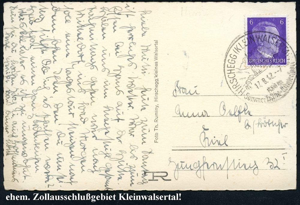 | 1731 | 35 € | GESCHICHTE ÖSTERREICH 1938-45 / OSTMARK : HIRSCHEGG (KLEINWALSERTAL)Sommerfrische.. 1942 (17.8.) HWSt = ehem. Zollausschlußgebiet auf EF 6 Pf. Hitler , s/w.-Foto-Ak.: Der hohe Jfen n. Kiel, seltene Verwendung! (Bo.1) | | |