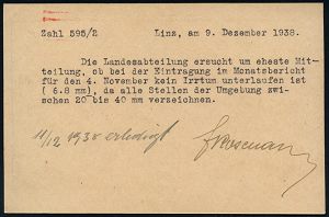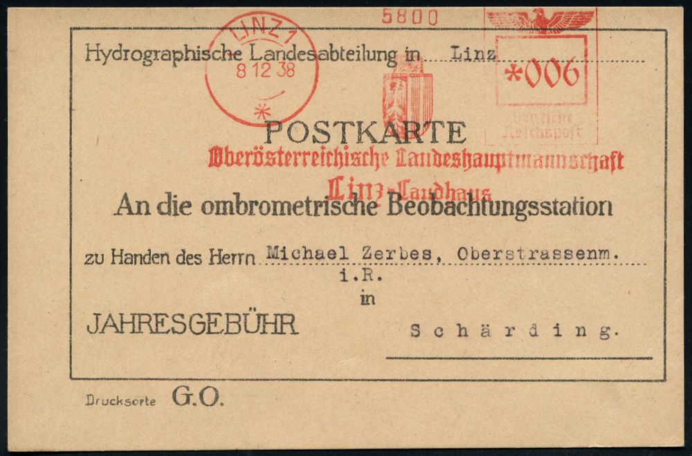 | 1732 | 25 € | GESCHICHTE ÖSTERREICH 1938-45 / OSTMARK : LINZ 1/ */ Oberösterr.Landeshauptmannschaft/ Linz,Landeshaus 1938 (8.12.) ehem., österr. ungenomter AFS Francotyp "Reichsadler" 006 Pf. (Wappen) Dienst-Kt.: Hydrographische Landesabteilung an die ombrometrische Beobachtungs-Station, Schärding (Dü.E-A5A, Nr.149, ungenormt!) | | |