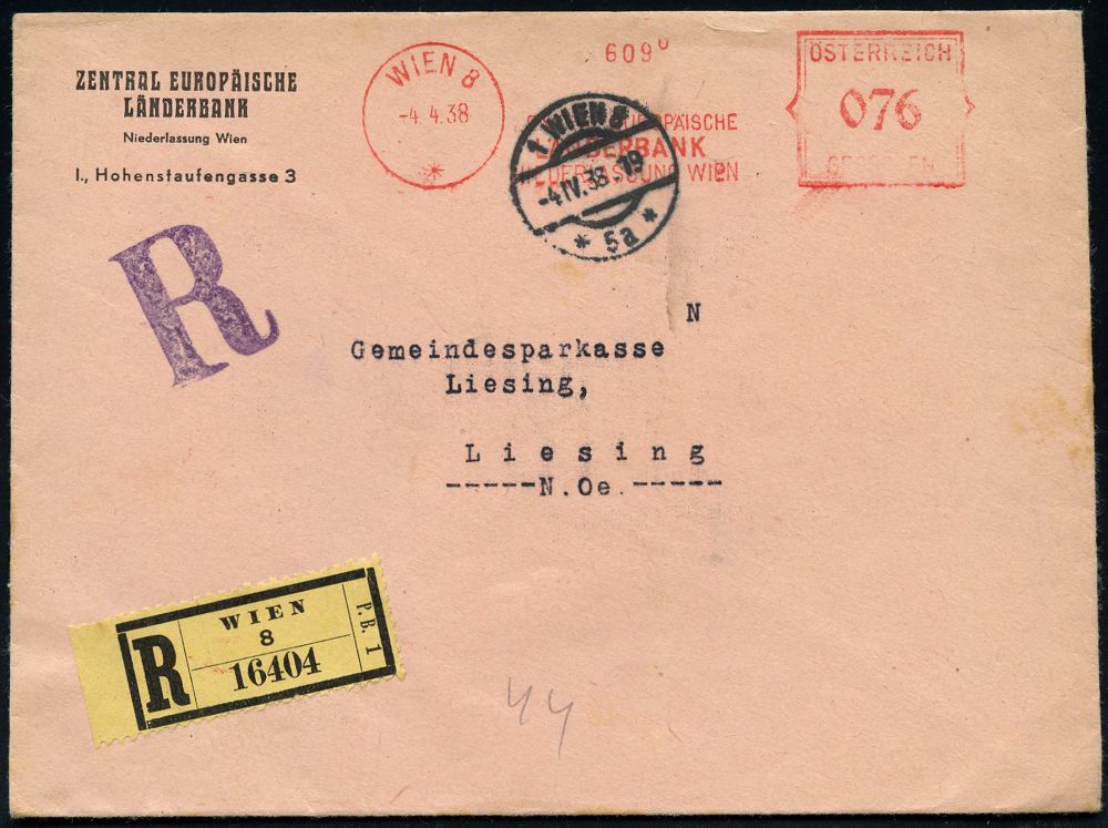 | 1735 | 35 € | GESCHICHTE ÖSTERREICH 1938-45 / OSTMARK : Wien 8 1938 (4.4.) österr. AFS Francotyp: WIEN 8/*/ ZENTRAL EUROPÄISCHE/LÄNDERBANK.. während der Besetzung Österreichs durch die Wehrmacht (12.3. - 20.5.1938) der sogen. "Anschluß" , 076 Gr. noch a l t e r Tarif! + österr. RZ: WIEN 8 + 1K-Brücke: 1 WIEN 8/* 5a *, seltener Inl.-R-Bf. aus der Übergangszeit! (Francotyp BAh, Nr.150) | | |