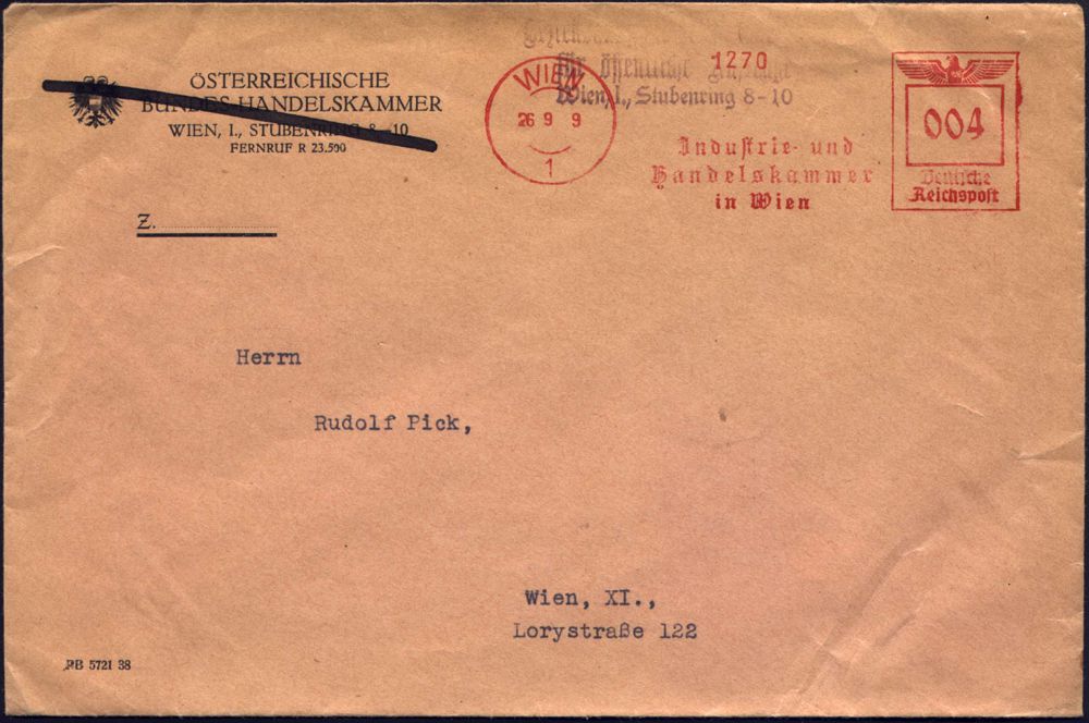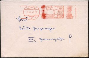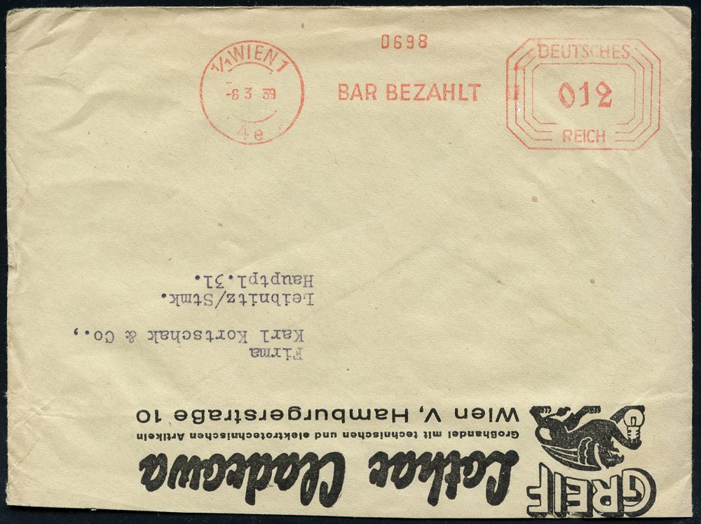 | 1744 | 23 € | GESCHICHTE ÖSTERREICH 1938-45 / OSTMARK : 1/1 WIEN 1/ 4e/ BAR BEZAHLT 1939 (8.3.) ehem., österr. PFS Francotyp "Achteck", mit Inschrift: "DEUTSCHES/REICH" 012 Pf. mit CB-Ziffern auf Reklame-Inl.-Bf.: GREIF Lothar Cladrowa (Dü.D-6 B, Nr.217) | | |