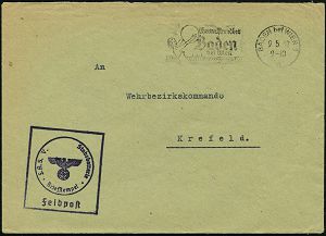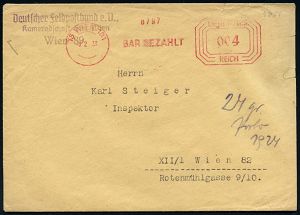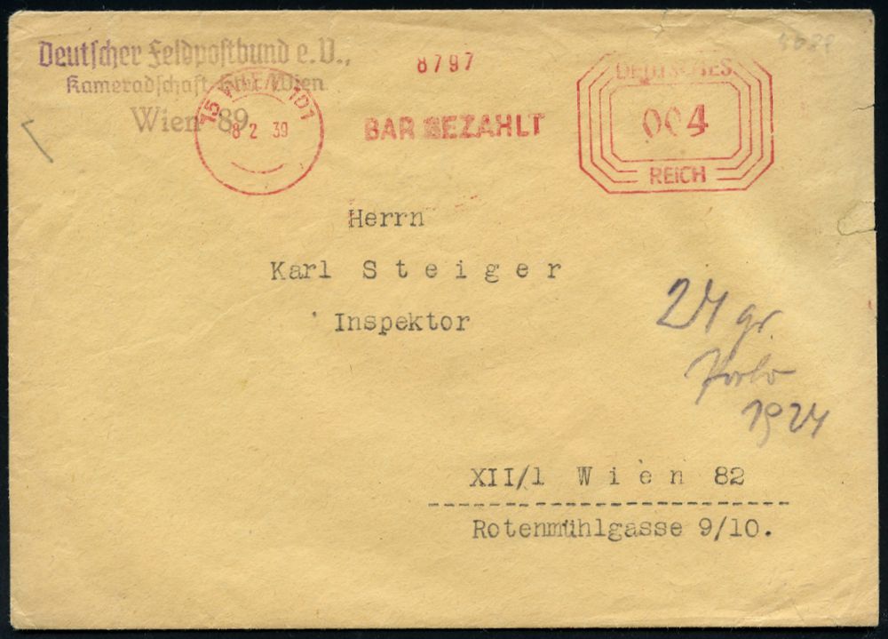 | 1743 | 25 € | GESCHICHTE ÖSTERREICH 1938-45 / OSTMARK : 15 WIEN 101/ BAR BEZAHLT 1939 (8.2.) ehem., österr. PFS Francotyp "Achteck" 004 Pf. mit Inschrift: DEUTSCHES REICH + viol. Abs.-3L: Deutscher Feldpostbund e.V..., Orts-Drs.-Bf. (Dü.D-6 B, Nr.217 D) | | |