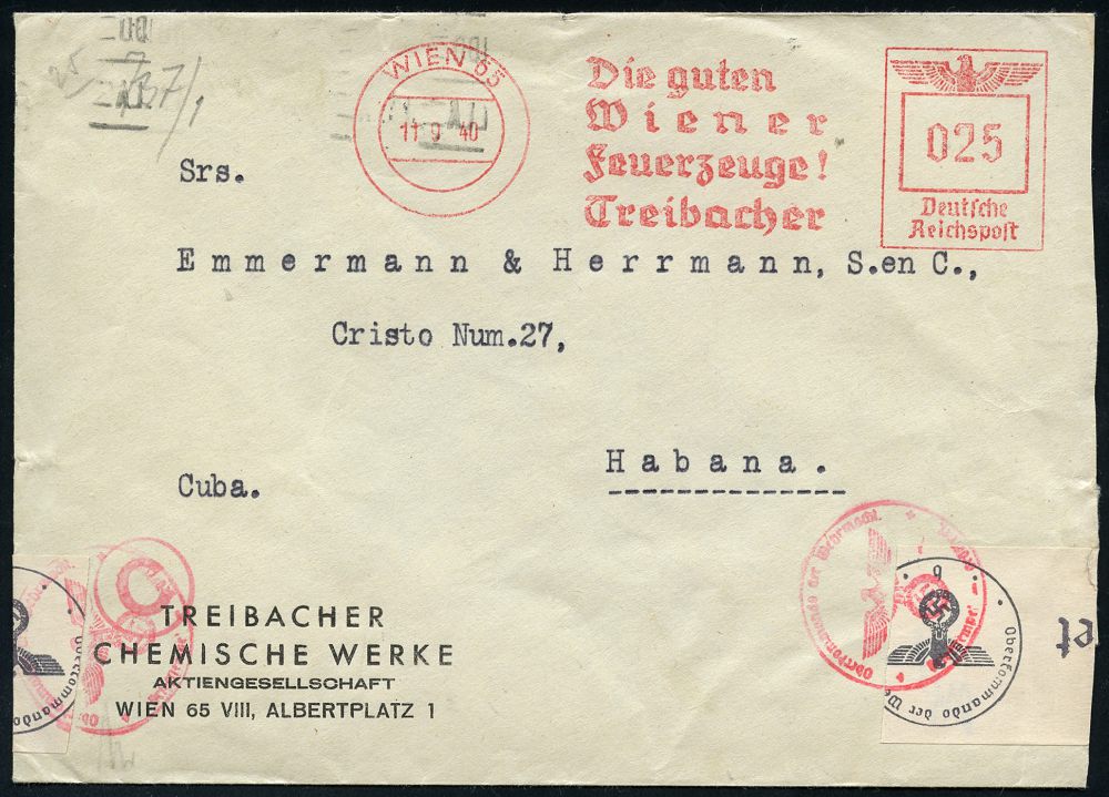 | 1750 | 40 € | GESCHICHTE ÖSTERREICH 1938-45 / OSTMARK : WIEN 63/ Die guten/ Wiener/ Feuerzeuge!/ Treibacher 1940 (11.9.) AFS Francotyp "Reichsadler" 025 Pf. + 2x roter OKW-Zensur-1K: geöffnet + Zensurstreifen "b" = Berlin (Rie.B-2 a + 40 Pkte., B-55) Firmen-Bf.: TREIBACHER CHEMISCHE WERKE AG, Übersee-Zensur-Bf. n. Habanna, Cuba!, rs. AS.: HABANA, CUBA, trotz britische Blockade!, sehr seltene Destination! (Dü.E-5CG) | | |