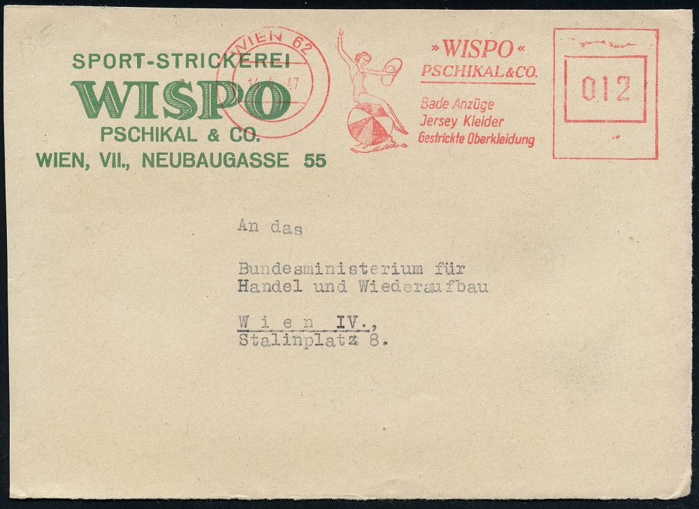 | 1764 | 16 € | GESCHICHTE ÖSTERREICH 1938-45 / OSTMARK : ÖSTERREICH 1947 (14.4.) aptierter, ehem. "Ostmark"-AFS Francotyp "Reichsadler" (= entfernt + Inschrift "Deutsches Reich"): WIEN 62/"WISPO"/PSCHIKAL & CO.. (Frau im Badeanzug mit Hut u. Ball) Firmen-Vorderseite: SPORT-STRICKEREI WISPO.. (Dü.E-13AK-129o) | | |