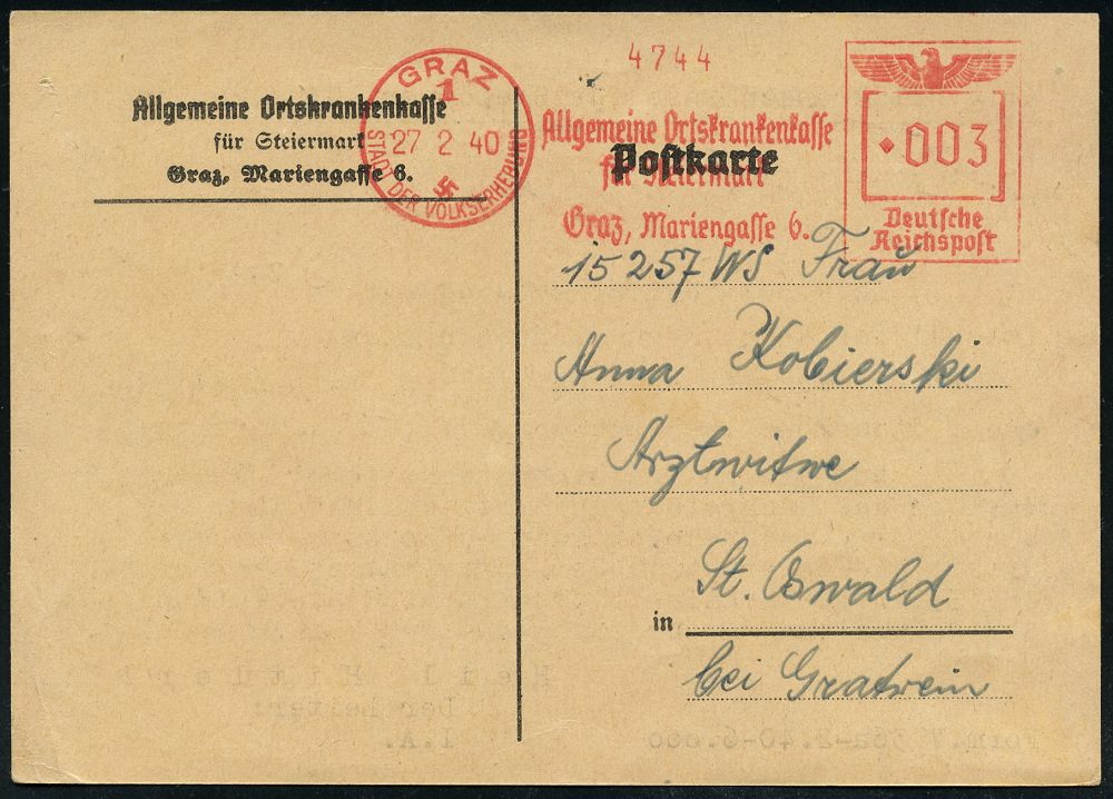 | 1729 | 18 € | GESCHICHTE ÖSTERREICH 1938-45 / OSTMARK : GRAZ/ 1/ STADT DER VOLKSERHEBUNG/ Allgem.Ortskrankenkasse.. 1940 (27.2.) AFS Francotyp "Reichsadler", Ortsstempel mit Zusatztext + Hakenkreuz (bezieht sich auf den gescheirten NS-Putsch von 1934) Fern-Kt., vergl. Los Nr.1730 u. 1733 ! (Dü.E-5DGh) | | |