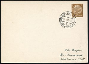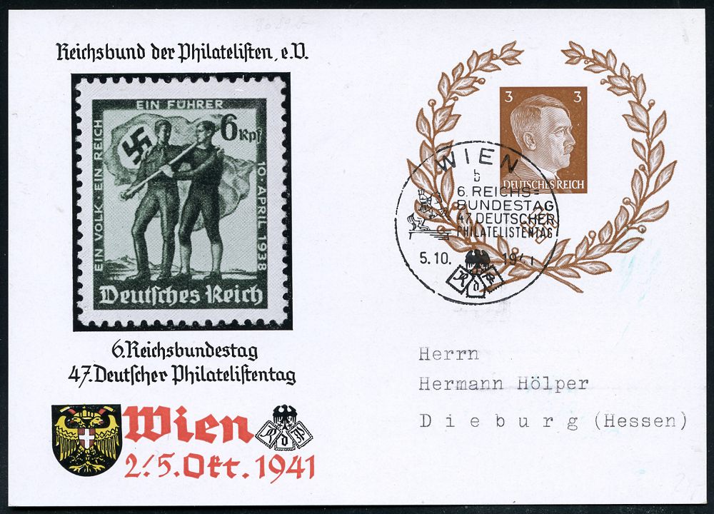 | 1755 | 18 € | GESCHICHTE ÖSTERREICH 1938-45 / OSTMARK : WIEN/ b/ 6.REICHS-/ BUNDESTAG/ 47.DEUTSCHER/ PHILATELISTENTAG 1941 (5.10.) SSt = Prinz Eugen v. Savoyen (Reiterstandbild) auf Sonder-P. 3 Pf. mit 6 Pf. "Österreich-Anschluß" etc. (Mi.P 306), Inl.-Karte (Bo.89 b) | | |