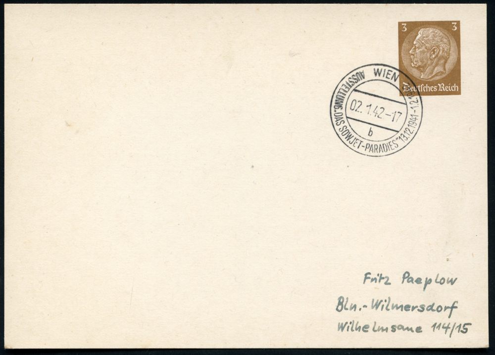 | 1757 | 18 € | GESCHICHTE ÖSTERREICH 1938-45 / OSTMARK : WIEN/ b/ AUSSTELLUNG "DAS SOWJET-PARADIES".. 1942 (2.1.) SSt auf PP 3 Pf. Hindenbg. (blanco, Mi.PP 122/A 1) klar gest. Inl.-Karte = anti-sowjetische Ausstellung, weitere Belege siehe auch Sektion: Deutsch-Sowjet. Beziehungen (Bo.91 b) | | |