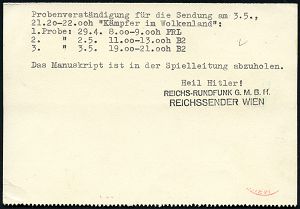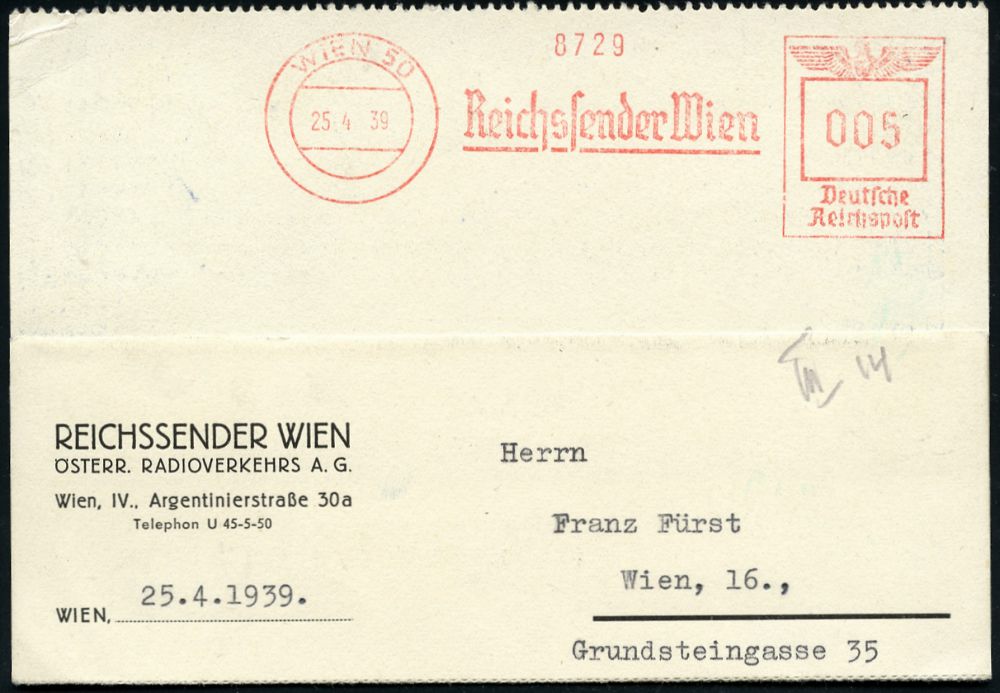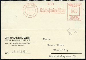 | 1745 | 25 € | GESCHICHTE ÖSTERREICH 1938-45 / OSTMARK : WIEN 50/ Reichs-Rundfunk GmbH/ Reichssender Wien 1939 (25.4.) seltener AFS Francotyp "Reichsadler" , klar gest. Dienst-Orts-Kt.: REICHSSENDER WIEN, ÖSTERR. RADIOVERKEHRS AG = ehem. Ravag, der Sender wurde nach dem "Anschluß" ideologisch gleichgeschaltet (Dü.E-5CGh) | | |