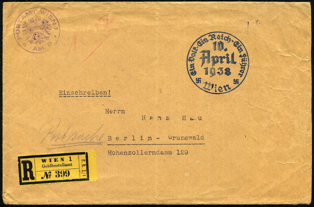 | 1738 | 35 € | GESCHICHTE ÖSTERREICH 1938-45 / OSTMARK : Wien/ Ein Volk-Ein Reich-Ein Führer.. 1938 (10.4.) seltener viol. SSt (2 Hakenkreuze) + alter österr. RZ: Wien 1/ Geldbestellamt (gelb/schw.) + alter viol. 1K-HdN: POSTAMT WIEN 1/Abt. 3 = österr. Adler!, rs. Bahn-Oval: DRESDEN - BODENBACH/BAHNPOST/Z 51 ---, seltener Übergangs-R-Bf. nach "Anschluß der Ostmark" n. Berlin (Bo.8, violett = selten!) | | |