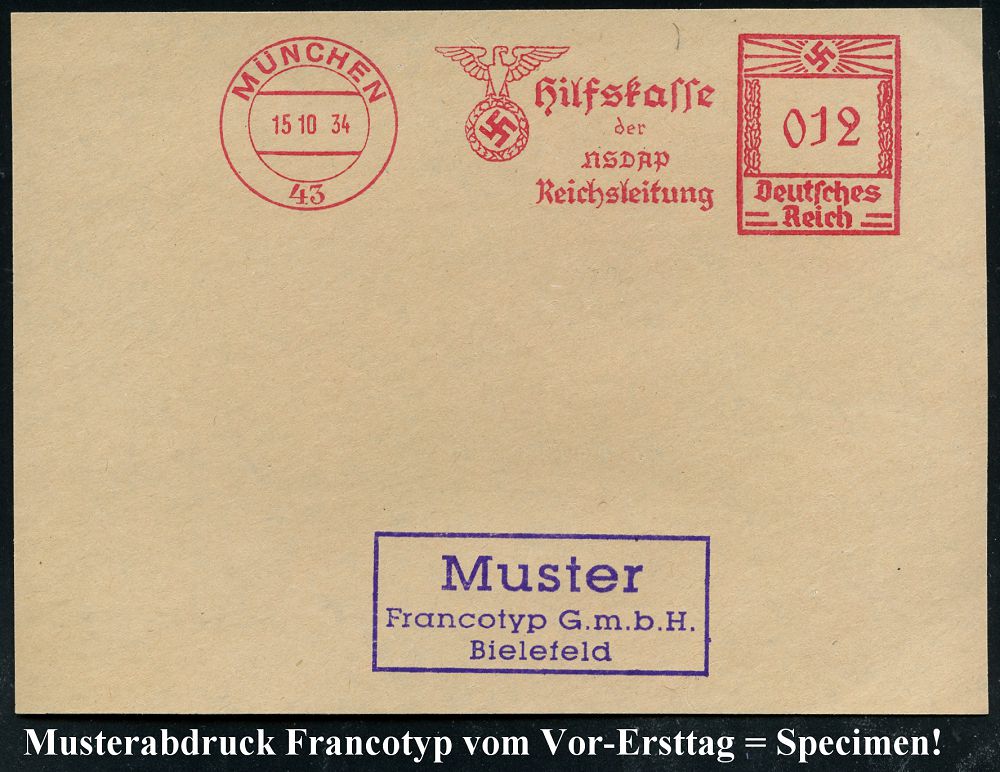 | 1733 | 40 € | GESCHICHTE ÖSTERREICH 1938-45 / OSTMARK : MÜNCHEN/ 43/ Hilfskasse/ der/ NDSAP/ Reichsleitung 1934 (15.10.) sehr seltenes AFS-Musterabdruck Francotyp "Hakenkreuz" (Hakenkreuz-Adler) = Hilfskasse für die Beteiligten am NS-Putsch in Österreich gegen Kanzler Dollfuß (wurde am 25.7.1934 ermordet) die Teilnehmer wurden interniert, glasklar gest. Francotyp-Musterblatt mit V o r - Ersttag! (Dü.E-3CEo) | | |