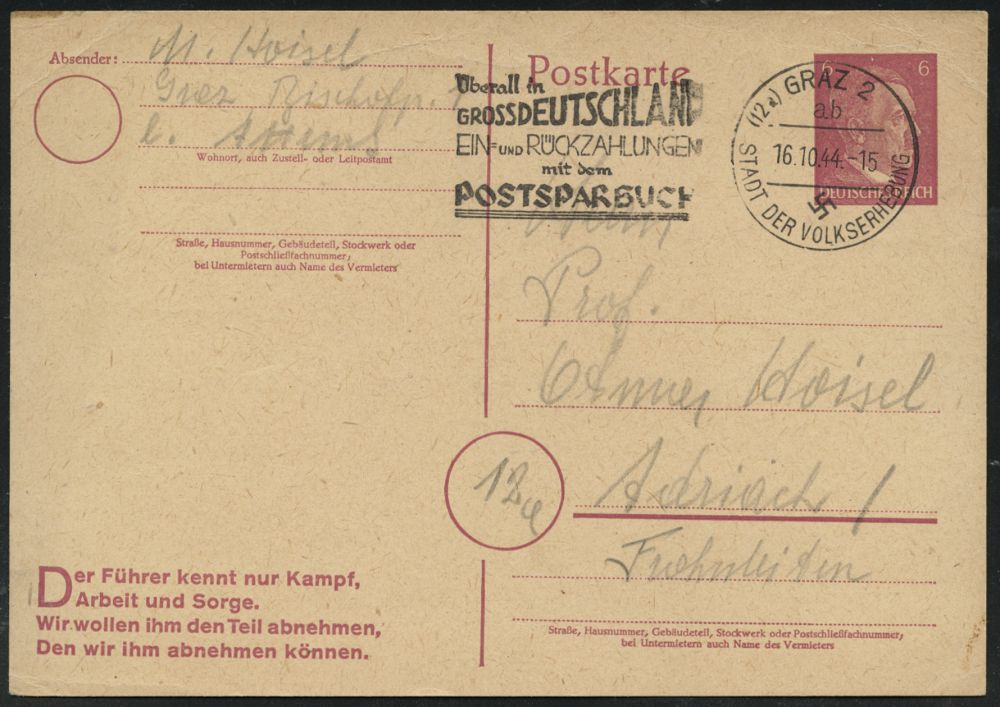 | 1730 | 18 € | GESCHICHTE ÖSTERREICH 1938-45 / OSTMARK : (12a) GRAZ 2/ ab/ SDV/ Überall in/ GROSSDEUTSCHLAND/ ...POSTSPARBUCH 1944 (16.10.) MWSt, Sonderform "SDV" = Stadt der Volkserhebung mit PLGZ , klar gest. Fernkt., (Bo.S 408 A mit PLGZ) | | |