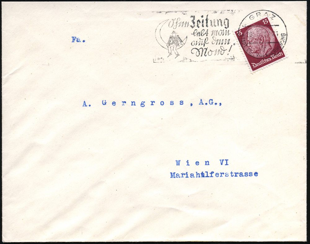 | 1728 | 20 € | GESCHICHTE ÖSTERREICH 1938-45 / OSTMARK : GRAZ/ 1/ as/ SDV/ Ohne Zeitung/ lebt man/ auf dem/ Mond! 1939 (10.3.) seltener MWSt, österr. Sonderform! , teils Sütterlin (Mann im Mond) seltener Inl.-Bf. (Bo.S 232 A, österr. Sonderform!) | | |