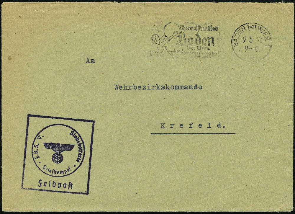 | 1725 | 14 € | GESCHICHTE ÖSTERREICH 1938-45 / OSTMARK : BADEN bei WIEN 1/ a/ Thermalstrandbad.. 1942 (9.5.) MWSt (Frau mit Medizinball) + teil-aptierter HdN: F.A.S. V. Stabs-batterie/ Feldpost (oben Text teils entfernt) Feldpost-Dienst-Bf. n. Krefeld (Bo.5 A, Bochmann 1942 unbekannt!) | | |