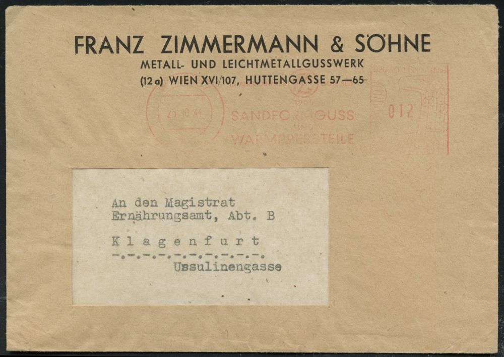 | 1760 | 45 € | GESCHICHTE ÖSTERREICH 1938-45 / OSTMARK : WIEN 107/ ..SANDFORMGUSS/ UND/ WARMPRESSTEILE 1944 (25.10.) sehr seltener AFS Postalia "Reichsadler" 012 Pf. (kleine Ovalziffern) auf Firmen-Bf.: FRANZ ZIMMERMANN & SÖHNE, METALL- U. LEICHTMETALLGUSSWERK (Dü.E-9, Nr.232) | | |