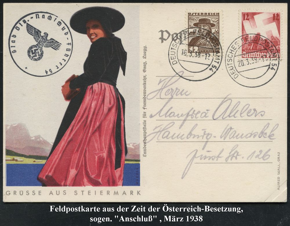 | 1761 | 50 € | GESCHICHTE ÖSTERREICH 1938-45 / OSTMARK : DEUTSCHES REICH 1938 (20.3.) 2K-Steg: DEUTSCHES FELDPOSTAMT 54 , 2x auf MiF Österreich 12 Gr. Trachten + 12 Pf. NSDAP-Parteitag + schw.-viol. 1K-HdN: Stab Div.-Nachschub-Führer 54, klar gest. Künstler-Color-Ak.: GRÜSSE AUS DER STEIERMARK (Tracht), rs. Text, klar gest., seltene Feldpost-Kt. von der Österreich-Besetzung, sogen. "Anschluß" | | |