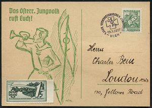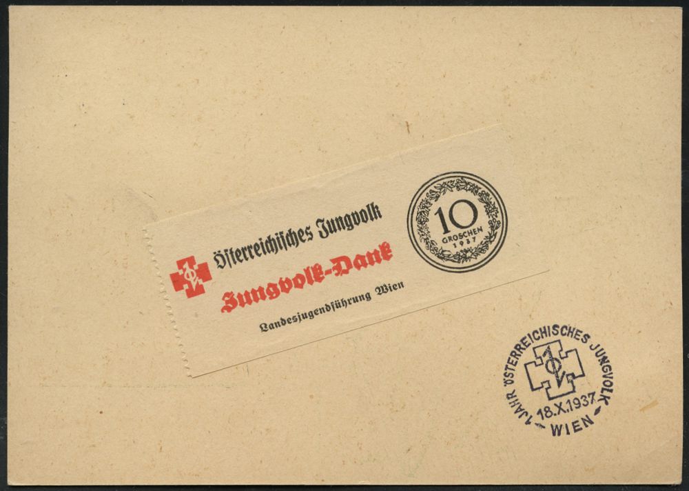 | 1762 | 45 € | GESCHICHTE ÖSTERREICH 1938-45 / OSTMARK : ÖSTERREICH 1937 (18.10.) SSt.: WIEN/ 1 JAHR ÖSTERREICHISCHES JUNGVOLK = austrofaschistische Jugend-Organisation ab Aug. 1936 - 1938 mit Logo: "Kruckenkreuz" , passende, grüne Sonder-Kt.: Das Österr. Jungvolk ruft Euch! (Fanfarenbläser, Jungvolk-Flagge) sig. MüMi + Schuschnigg-Spendenmakre 1 Sch., grün (Mi. + 40.- EUR), 1938 von den Nazis aufgelöst, seltene Ausl.-Karte, rs. Jungvolk-Spenden-Vignette (Mi.572 EF) | | |