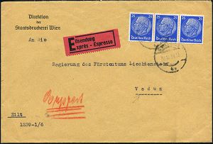 | 1747 | 25 € | GESCHICHTE ÖSTERREICH 1938-45 / OSTMARK : Wien 1939 (28.11.) 25 Pf. Hindenbg., blau, reine MeF: horizontaler 3er-Streifen (gest. WIEN) Dienst-Bf.: Direktion der Staats-druckerei Wien (u.a. Druck von Banknoten u. Briefmarken etc.), Ausl.-Eil-Dienst-Bf. o h n e Zensur an Regierung Liechtenstein, Vaduz (o. AS.), seltene Frankatur! (Mi.522 MeF) | | |