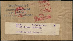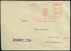 | 1740 | 20 € | GESCHICHTE ÖSTERREICH 1938-45 / OSTMARK : WIEN 1/ */ Das/ Wiener Journal 1938 (18.6.) aptierter, ehem. österr. AFS Francotyp mit altem Orts-1K mit Stern u. neuem Wertrahmen "Reichsadler" 005 Pf. (ungenormt) + blauer 5L: Drucksache!/Journal expédié/par éditeur.., kleines Zeitungs-Sb n. Halle (Dü.E-5Ah, ungenormt) | | |
