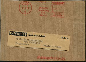 | 1749 | 18 € | GESCHICHTE ÖSTERREICH 1938-45 / OSTMARK : WIEN/ 1/ Ostmärkischer/ Zeitungsverlag/ A.G. 1940 (12.8.) AFS Francotyp "Reichsadler" 004 Pf. + roter 1L: Zeitungsdrucksache , Zeitungs-Streifband.: GRATIS Nach der Arbeit V.b.b. n. Halle/S. (Dü.E-5Ah) | | |