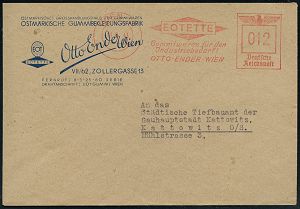 | 1753 | 25 € | GESCHICHTE ÖSTERREICH 1938-45 / OSTMARK : WIEN 62/ EOTETTE/ Gummiwaren für den/ Jndustriebedarf/ OTTO ENDER WIEN 1943 (19.2.) seltener AFS Francotyp "Reichsadler", Sonderform große, ovale Wertzifffern! (Firmenlogo) Firmen-Bf.: OTTO ENDER.. GUMMIWAREN (Dü.111 A, nur eine Maschine in Österreich!) | | |