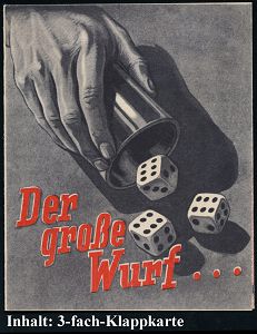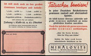 | 1751 | 35 € | GESCHICHTE ÖSTERREICH 1938-45 / OSTMARK : 1 WEIN 1/ b/ Deutsches/ Reich 1940 (16.9.) aptierter PFS 3 Pf. Adlerkopf/ Hakenkreuz + 3 Striche links = Sonderform, nur in Wien! , klar gest. (links etw. verkürzter Lotterie-Reklame-Bf. + Inhalt: Der große Wurf = Glücksspiel-Würfel etc. (Klapp-Karte mit div. Glückspiel- u. Lotto-Angeboten), 2 Belege kompl.! (Dü.216) | | |