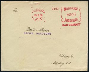 | 1741 | 20 € | GESCHICHTE ÖSTERREICH 1938-45 / OSTMARK : Wien 76 1938 (15.6.) ehem., österr. PFS Francotyp: 10 WIEN 76/*003 GROSCHEN/BAR BEZAHLT noch unverändert nach dem "Anschluß" Österreichs (wie immer leicht abgenutzt) Orts-Dr., seltener Übergangs-Beleg!, nur kurze Verwendungszeit! | | |