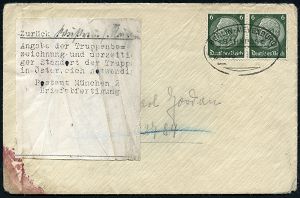 | 1726 | 65 € | GESCHICHTE ÖSTERREICH 1938-45 / OSTMARK : DEUTSCHES REICH 1938 (15.4.) frankierter Feldpost-Bf., Paar 6 Pf. Hindenbg., Bahnpost-Oval: BERLIN-MEYENBURG.. an Feldpost-Nr. 02784 + amtl. Klebezettel: Zurück.., Angabe der Truppenbe-/zeichnung und derzeiti-/gen Standort der Trppe/in Österreich notwendig/ Postamt München 2.. (Mi.81 + 100.- EUR, 2009), seltener Retour-Feldpost- während der Österreich-Besetzung, sogn. "Anschluß" (Mi.516 MeF) | | |