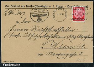| 1734 | 30 € | GESCHICHTE ÖSTERREICH 1938-45 / OSTMARK : WAIDHOFEN a.d.THAYA/ =1129=/ Der Landrat/ des Kreises/ Waidhofen.. 1941 (14.3.) seltener Freimarkenstempel mit Kennung (Hakenkreuzadler) = Frankier-Apparat zur Vorausentwertung (der Fa. Telefonbau & Normalzeit, Ffm.) Dienst-Vorderseite: Der Landrat.., | | |
