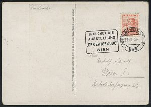 | 1737 | 40 € | GESCHICHTE ÖSTERREICH 1938-45 / OSTMARK : WIEN/ AUSSTELLUNG-DER EWIGE JUDE/ BESUCHET DIE/ AUSSTELLUNG 1938 (28.11.) FaWSt ohne UB klar auf patriotischer Color-Künstler-Prpaganda-Ak.: "Heimkehr Österreichs ins Reich" (nach Gemälde von H. Bergmeister) klar gest. Orts-Drs.-Karte selten! (Bo.13 , Type I = ohne UB) | | |