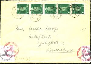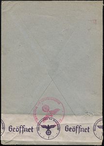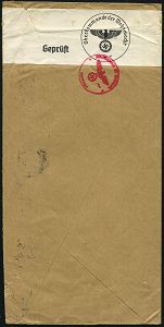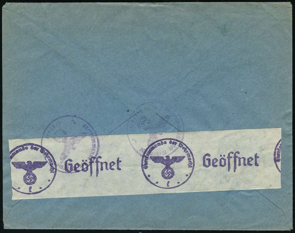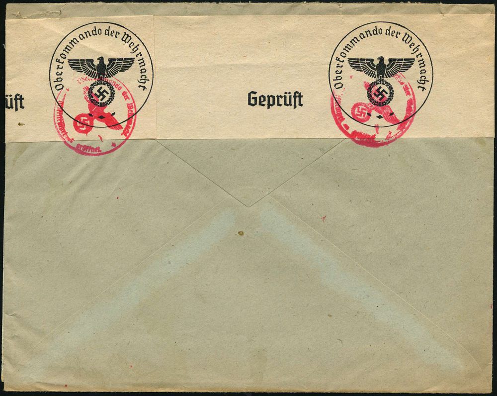 | 2635 | 20 € | ZENSURPOST II. WELTKRIEG (1.9.1939 - 8.5.1945) : LEIPZIG/ N 22/ OEHME & BAIER 1942 (16.4.) AFS Francotyp "Bogenrechteck" 025 Pf. + OKW-Zensurstreifen "b" + roter Band-MaSt. 7 Striche durchgehend = Spätverwendung! (= Berlin, Rie. B-20 + 100 Pkte., B-55 Streifen) Ausl.-Zensur-Bf. n. Schweden (Dü.E-1CEh) | | |